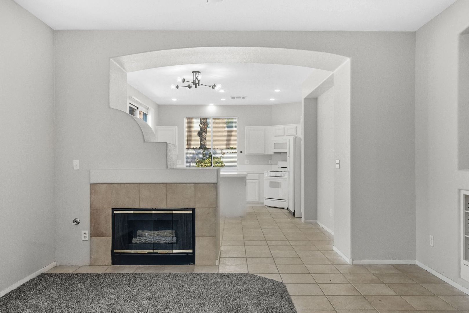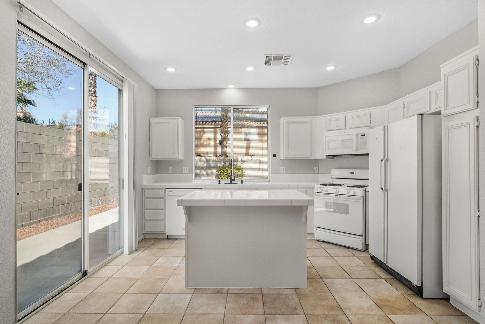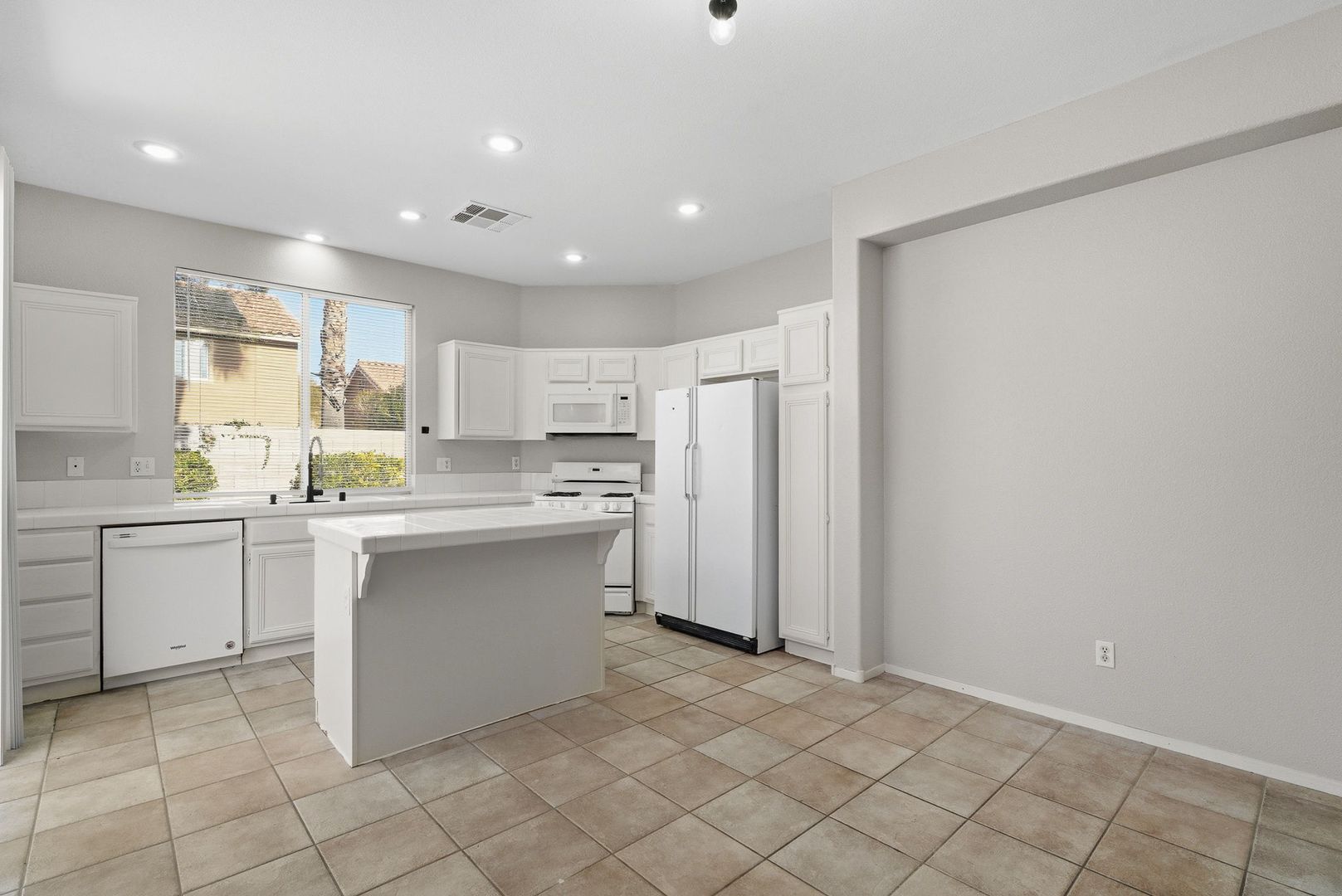 The bright eat-in kitchen boasts a functional prep island and comes fully equipped with all appliances, including a microwave, refrigerator, washer, and dryer. Beautiful tile flooring flows throughout much of the home, adding a touch of elegance and easy maintenance.