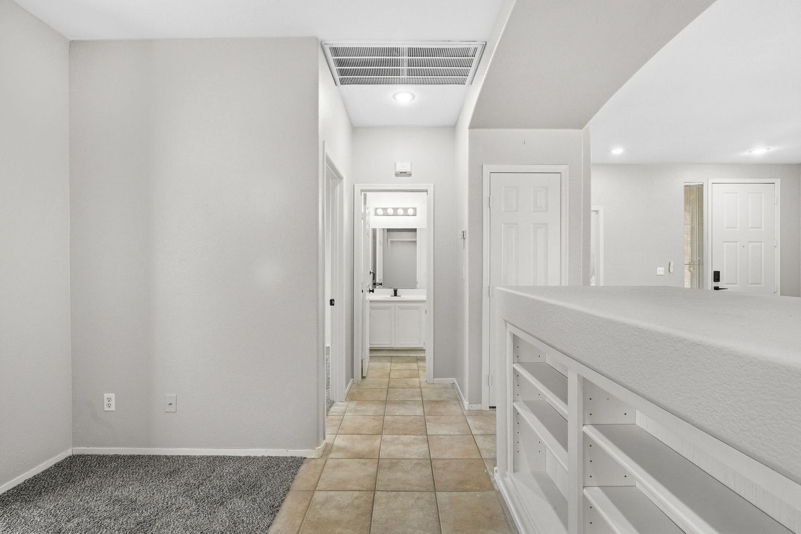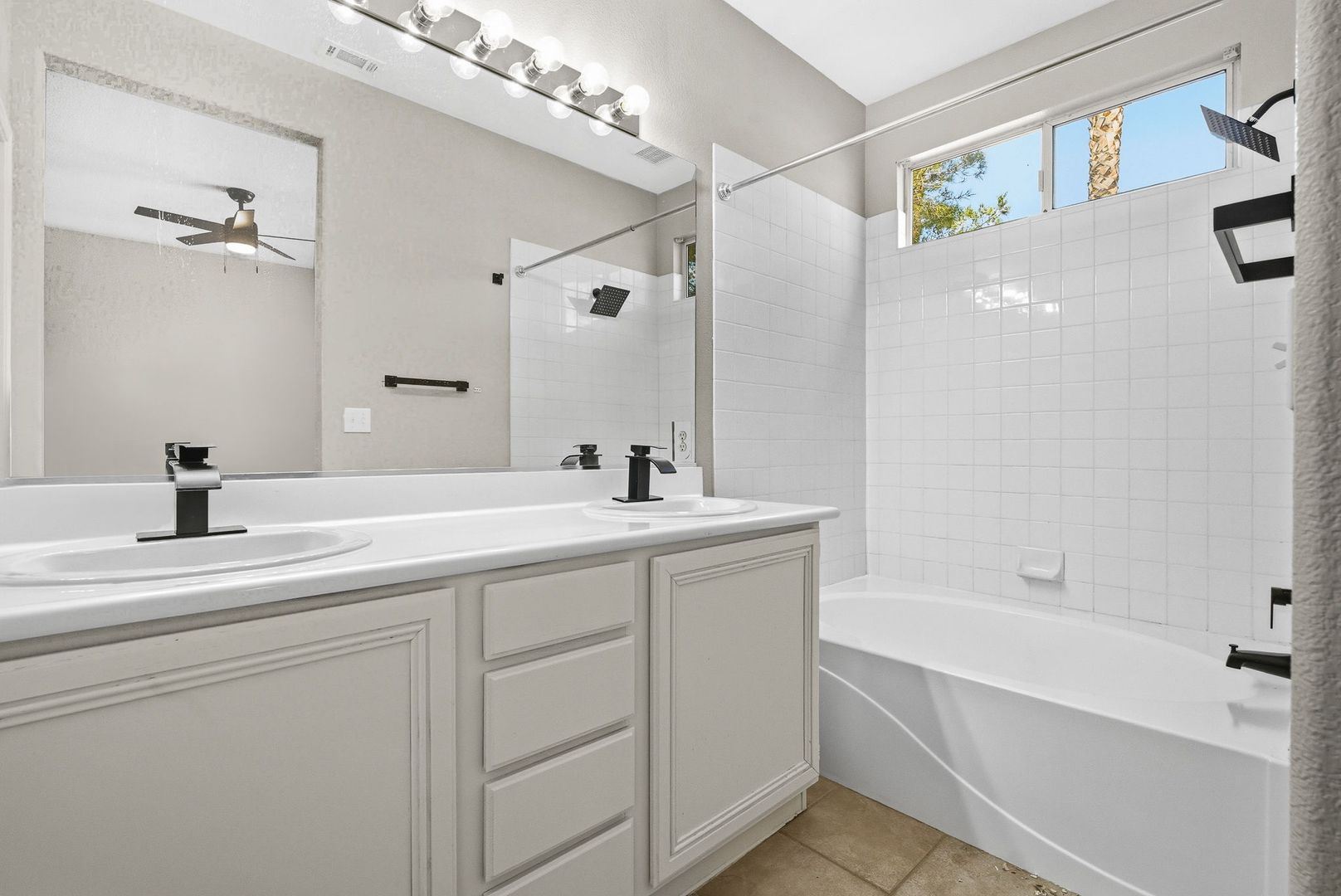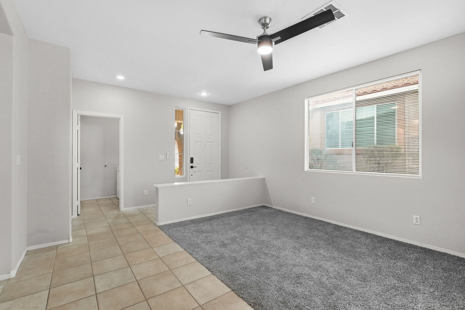 The bright eat-in kitchen boasts a functional prep island and comes fully equipped with all appliances, including a microwave, refrigerator, washer, and dryer. Beautiful tile flooring flows throughout much of the home, adding a touch of elegance and easy maintenance.